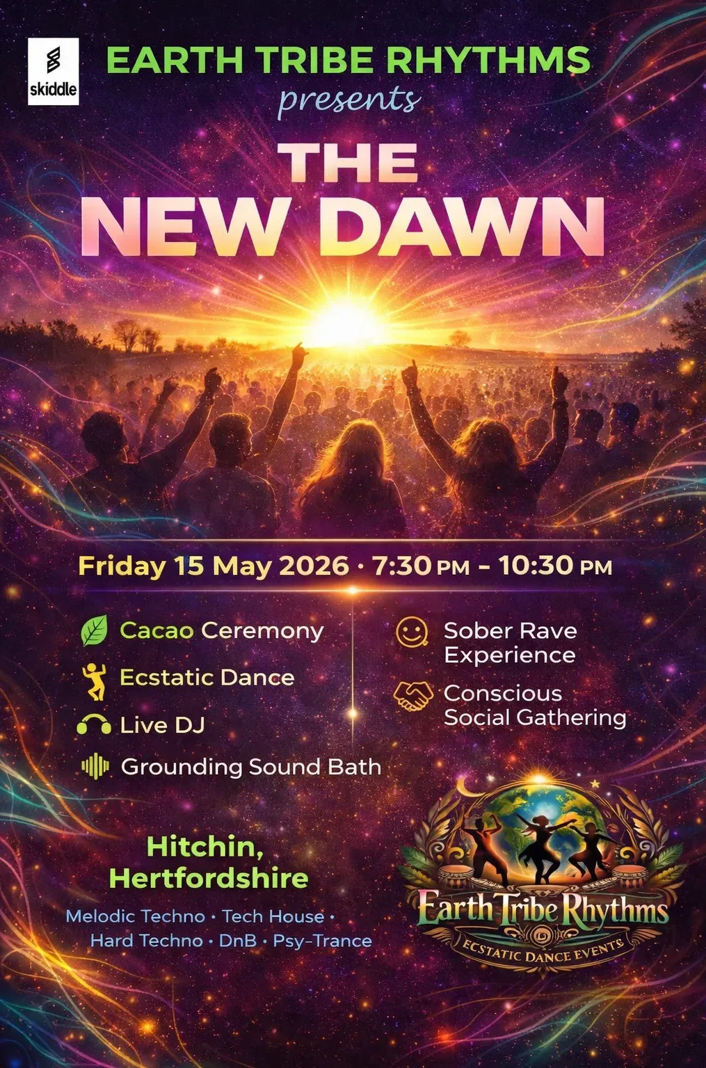 We are delighted to invite you to the return of Earth Tribe Rhythms Ecstatic Dance onFriday, 15 May 2026 with our special gathering, “The New Dawn”. Join us as we come together to celebrate life, honour ourselves and each other, through Music, Dance, Sacred Sounds and Heart Opening Cacao